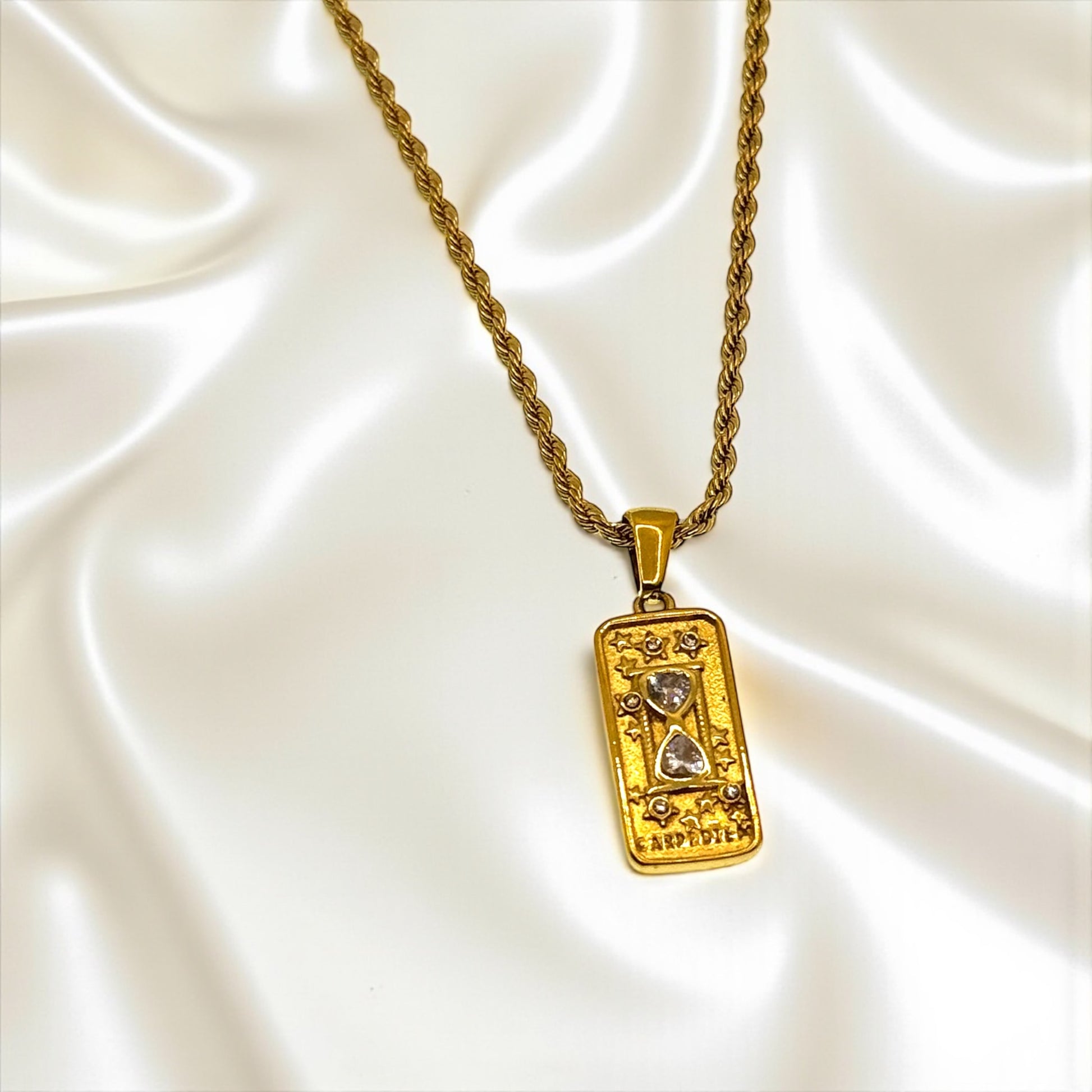 Der goldene Anhänger zeigt eine fein gearbeitete Sanduhr, umgeben von funkelnden Sternen – ein Sinnbild für das Vergehen der Zeit und die Magie, die im Innehalten liegt. Die edle Kordelkette verleiht dem Design einen luxuriösen, zeitlosen Charakter. Ein Schmuckstück für alle, die an Schicksal und göttliches Timing glauben.