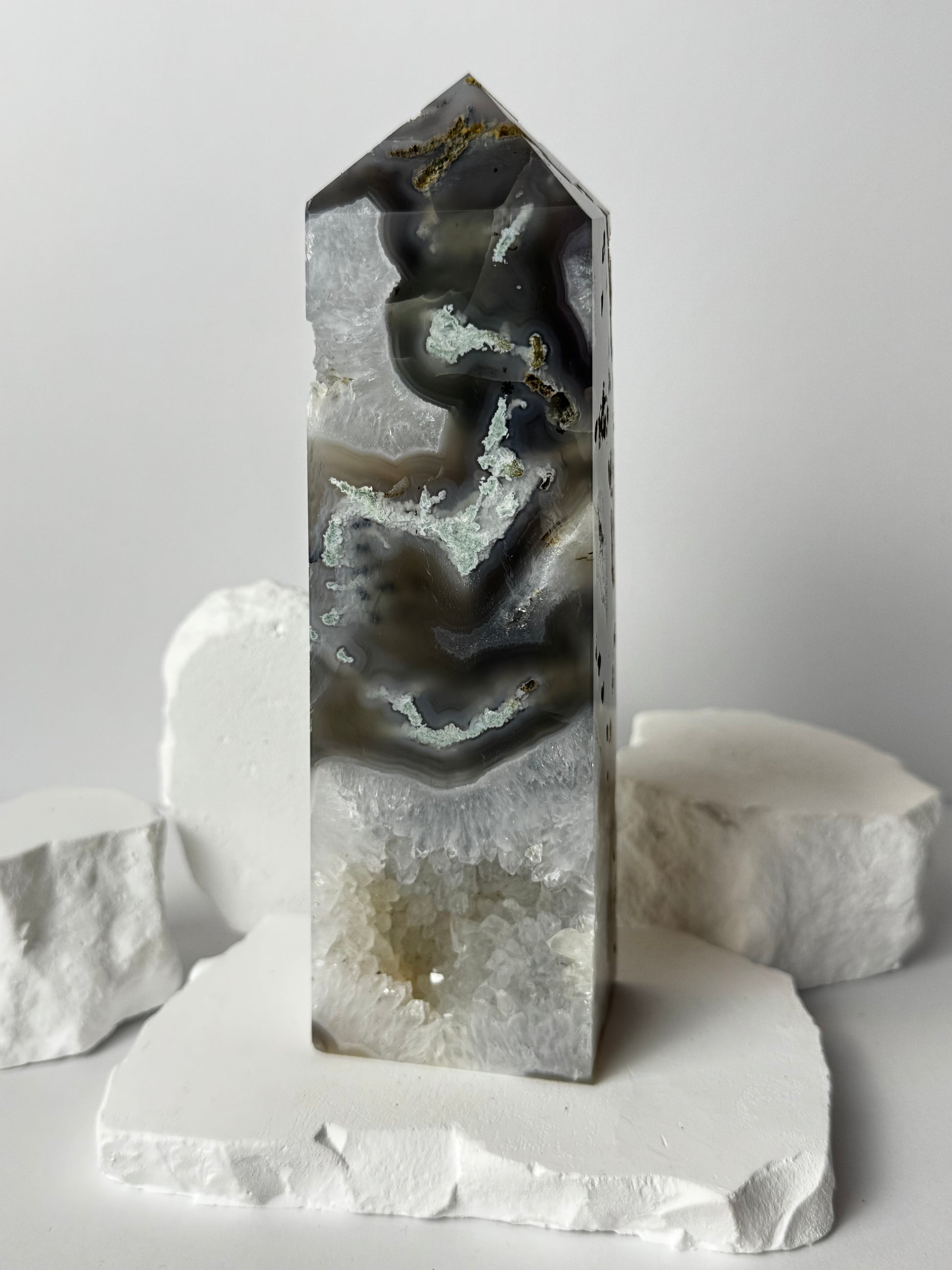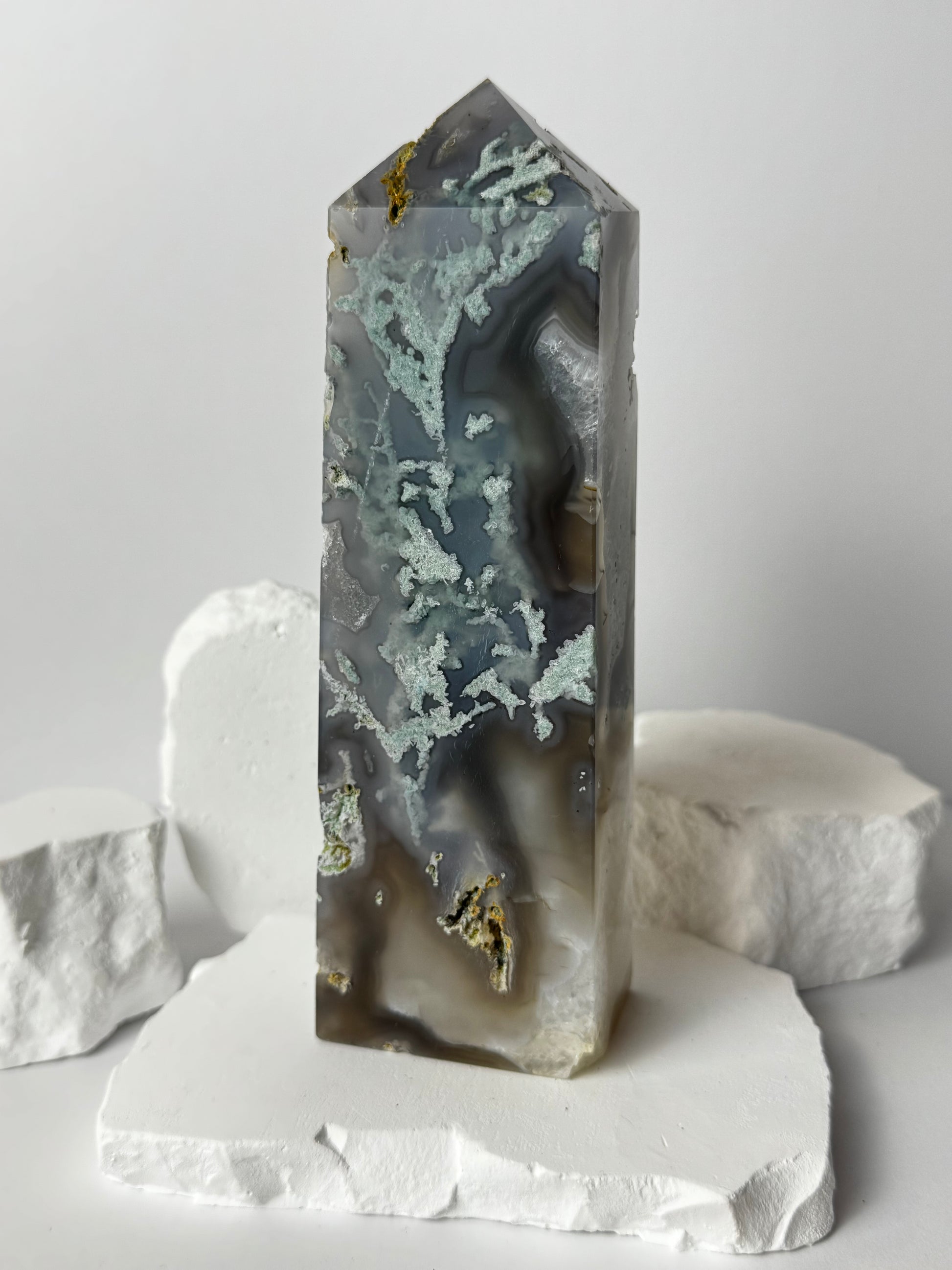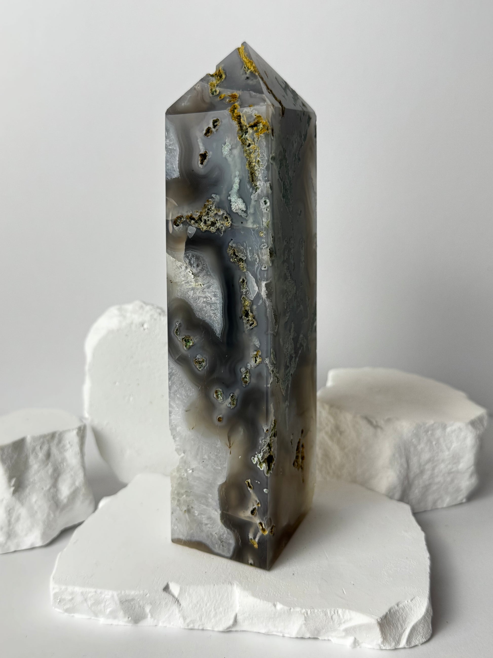 Moosachat ist ein Stein der Naturverbundenheit, Heilung und Erdung. Er fördert innere Balance, emotionale Stabilität und spirituelles Wachstum. Die wunderschöne, moosartige Maserung erinnert an Wälder, Wiesen und den beruhigenden Rhythmus der Natur. In Turmform verstärkt der Moosachat seine ausstrahlende Energie und leitet sie gezielt in den Raum – perfekt für Meditation, Schutz und Raumharmonisierung.